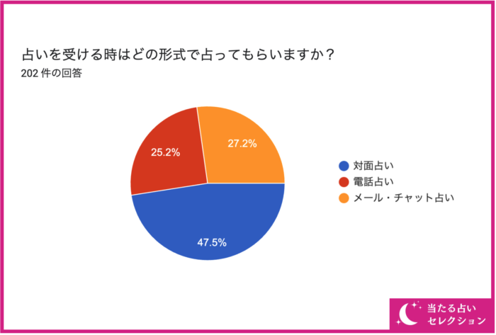 下記の図を見て分かる通り、占いを受ける時には約47%の人が『対面占い』を選んでいることが分かりました。
